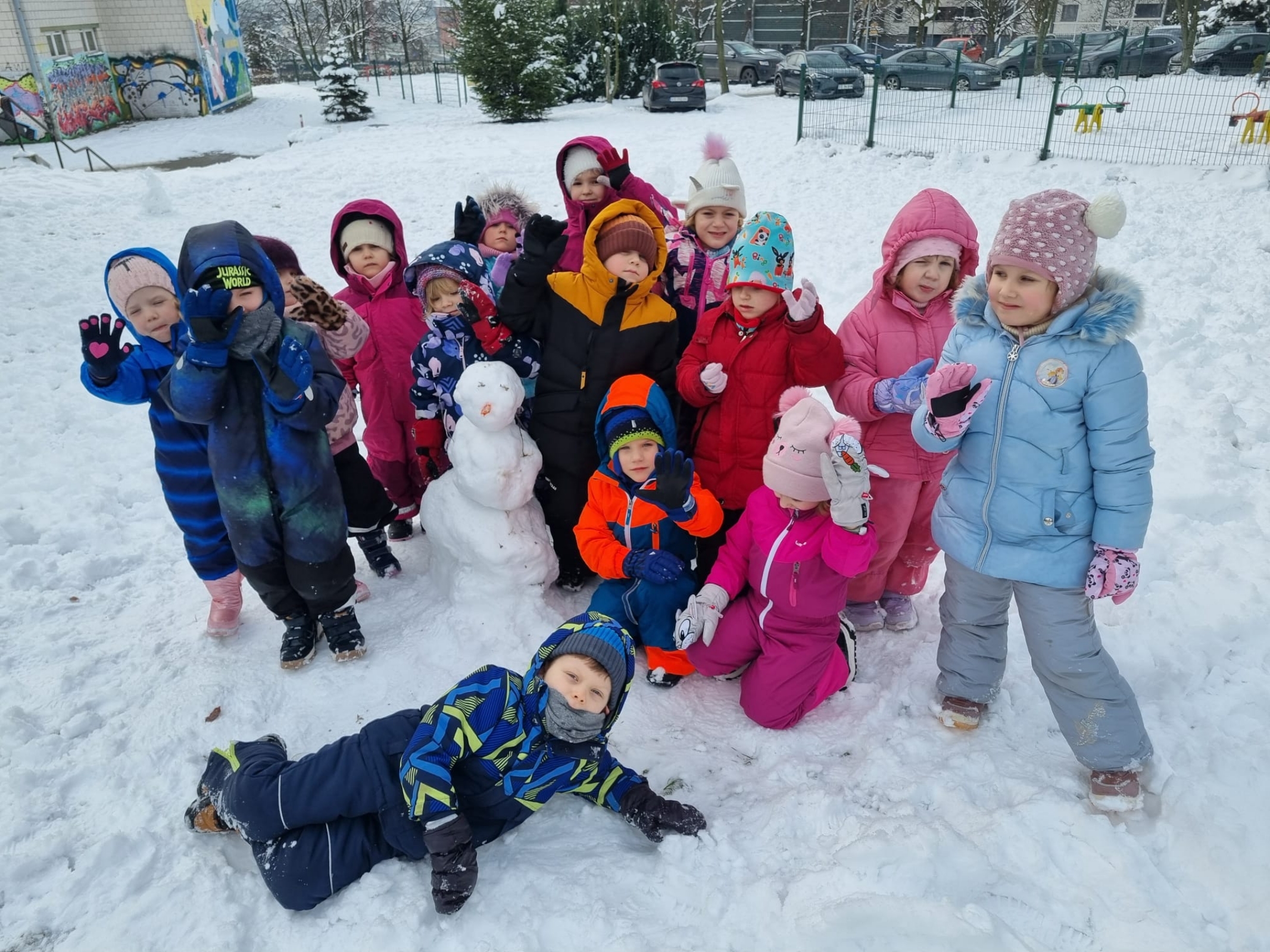 Dzieci z entuzjazmem lepiły ze śniegu, rzucały śnieżkami oraz robiły aniołki. Podczas zabawy nie brakowało śmiechu i radosnych okrzyków. Każdy chciał spróbować różnych zimowych aktywności. Na koniec powstał wspólny, całkiem spory bałwanek.