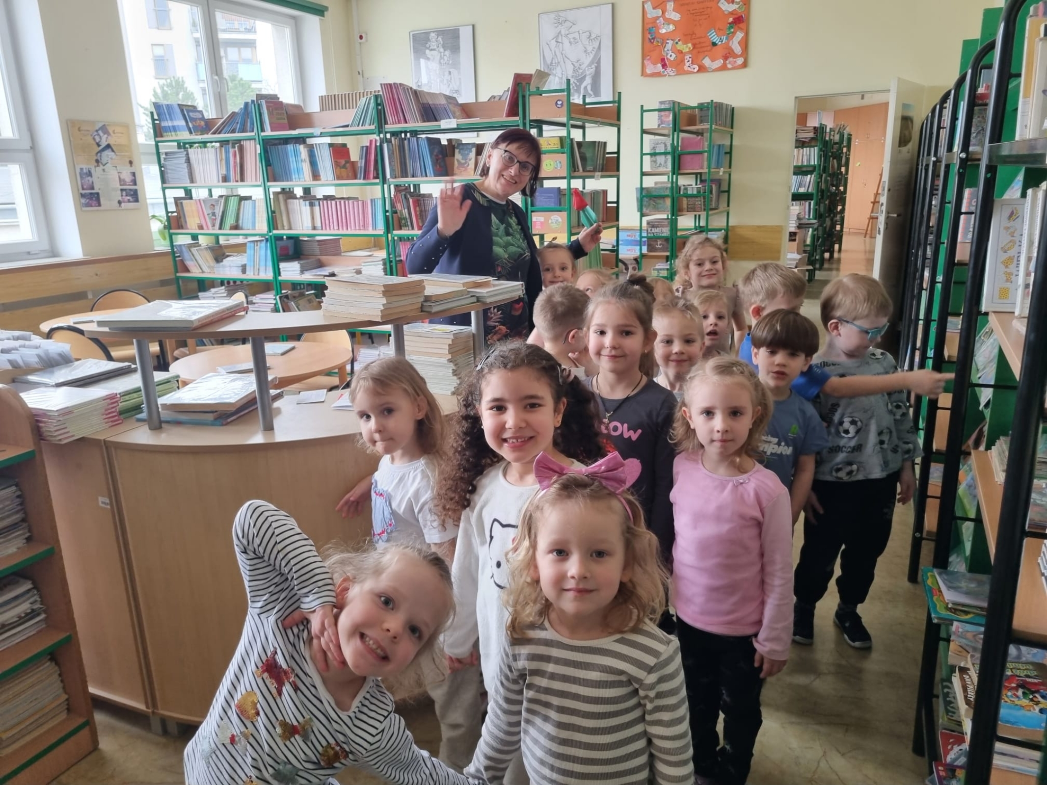 Przedszkolaki były pod wrażeniem ilości książek, jakie mieści w swych podwojach biblioteka. Miały możliwość pooglądać wybrane pozycje. Pani Jola przeczytała również fragment książki G. Kasdepke „Niesforny alfabet”. Aby poznać inne literkowe przygody wypożyczyliśmy książkę do przedszkola. Z chęcią odwiedzimy bibliotekę ponownie bo lubimy książki i bardzo nam się tu podobało.